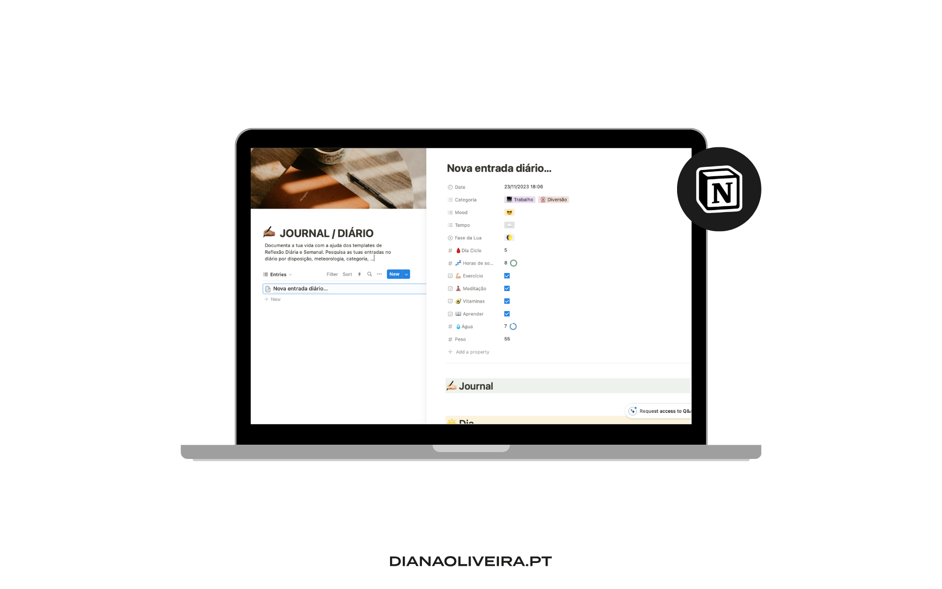 Escreve-te com verdade, sem julgamentos. Este diário em Notion convida-te a parar, sentir e refletir com leveza.